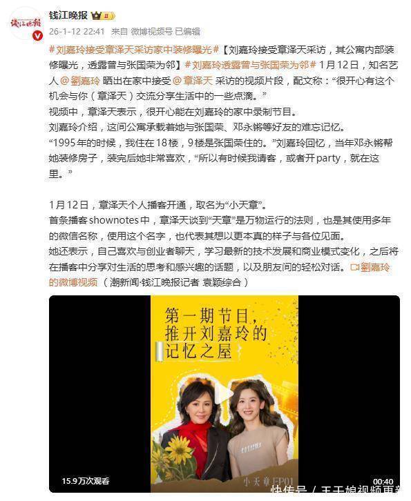 1 月 13 号下午,《小天章》首期完整版上线,不到一个小时收听量就破了万。有人为刘嘉玲和张国荣的友情感动,有人被章泽天的采访风格圈粉,还有人盯着刘嘉玲家的装修细节讨论 —— 从客厅的水晶灯到书房里的藏书,每一样都透着生活的质感。有网友评论:“看她们聊天,就像在听两个老朋友讲故事,舒服又治愈。”